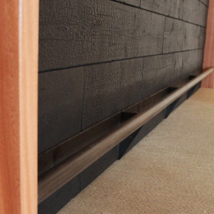 Le comptoir du bar a été réalisé en sapelli et en bois résineux brûlé suivant la technique du Shou Sugi Ban. Le grand module comprend une barre repose-pieds soudée à l’atelier. Côté service, le bar dispose de nombreux rangements.