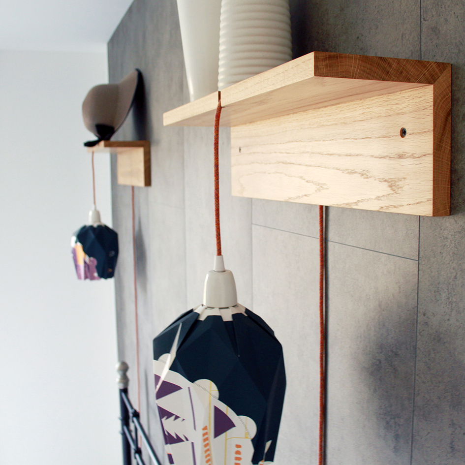 Les étagères sont réalisées en chêne massif. Nous y avons appliqué une huile mate incolore dont la composition se veut la plus naturelle possible. Une rainure continue permet le passage du câble textile de la lampe. Les étagères sont volontairement disposées en hauteur afin d’y disposer des éléments de décoration ainsi que des plantes d’intérieures recommandées pour améliorer la qualité de l’air ambiant.